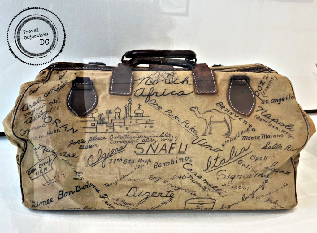 The travel bag owned by Sergeant Gary Uchida, a Nisea soldier of the 100th Infantry Battalion. He recorded his travels around Europe and North Africa on the bag.