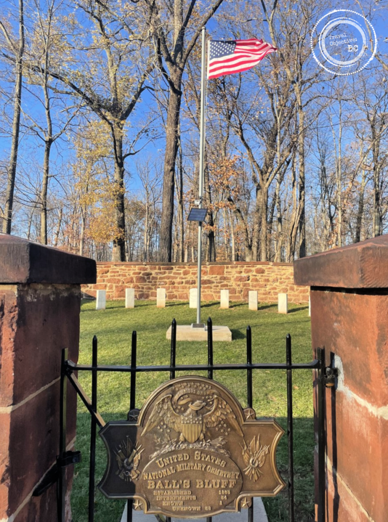 After the battle, Confederate troops removed their dead to Leesburg. A Union burial detail temporarily interred Union remains in a mass grave on the battlefield. Both sides returned many identified remains to their hometowns for burial. After four years, the U.S. Army established a national cemetery on Ball’s Bluff and buried the last 54 remains still interred on the battlefield. Within the cemetery’s stone wall, 25 markers are arrayed around a flagpole. Only one soldier is identified, Private James Allen of the 15th Massachusetts.
