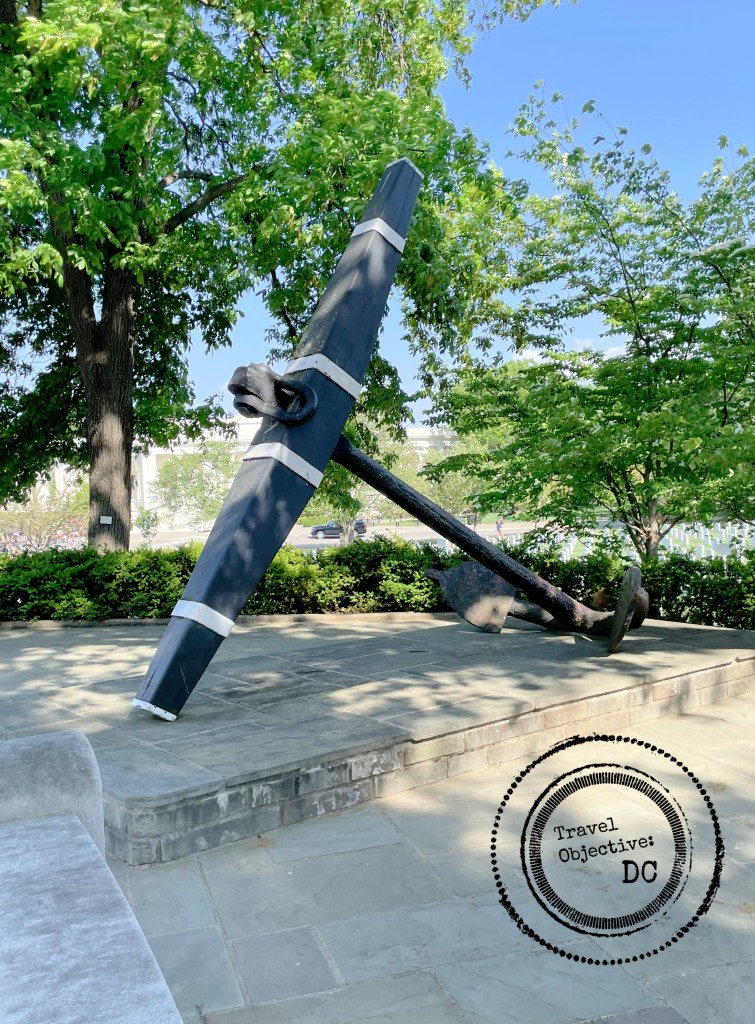 A paved lane encircles the memorial. To the east is an anchor made specifically for the memorial but resembling the anchor onboard the Maine.  Positioned along the back of the memorial are two bronze Spanish mortars, cast in the 1700s and captured by Admiral George Dewey in the Philippines during the Spanish–American War.