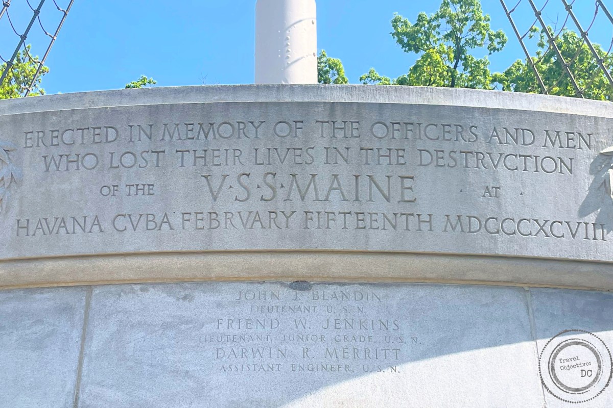 Fortunately, any visitor to Arlington National Cemetery can also “Remember the Maine”. A short walk from the Tomb of the Unknown Soldier will lead to the USS Maine memorial.  Observe the neatly organized graves and note the names along the memorial’s wall.