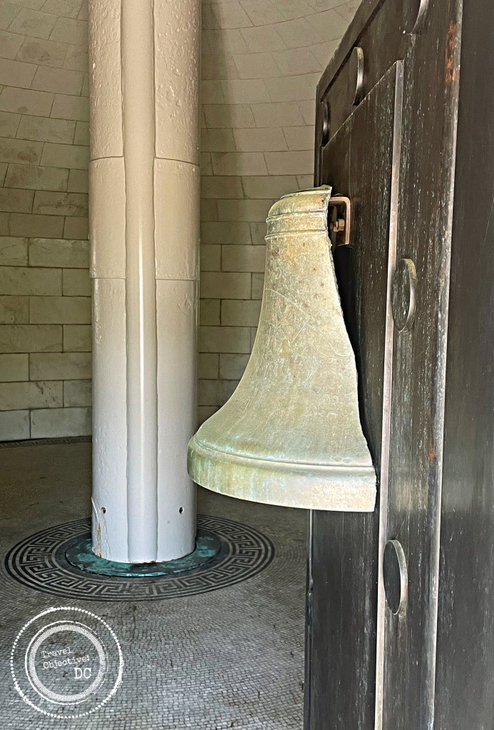 The mast of the USS Maine passes through the stone structure and is embedded into the floor. A surviving piece of the ship’s bell is hung on the front door.