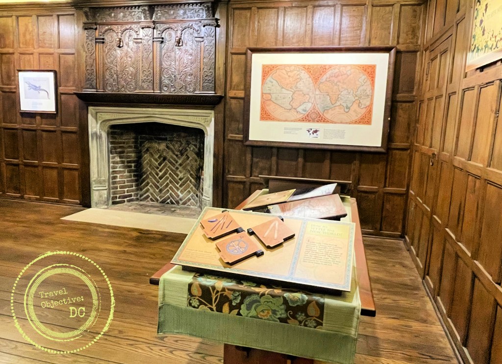 Reproductions of maps and illustrations drawn by Captain John White hang on the historical wood paneling in the Elizabethan Room.