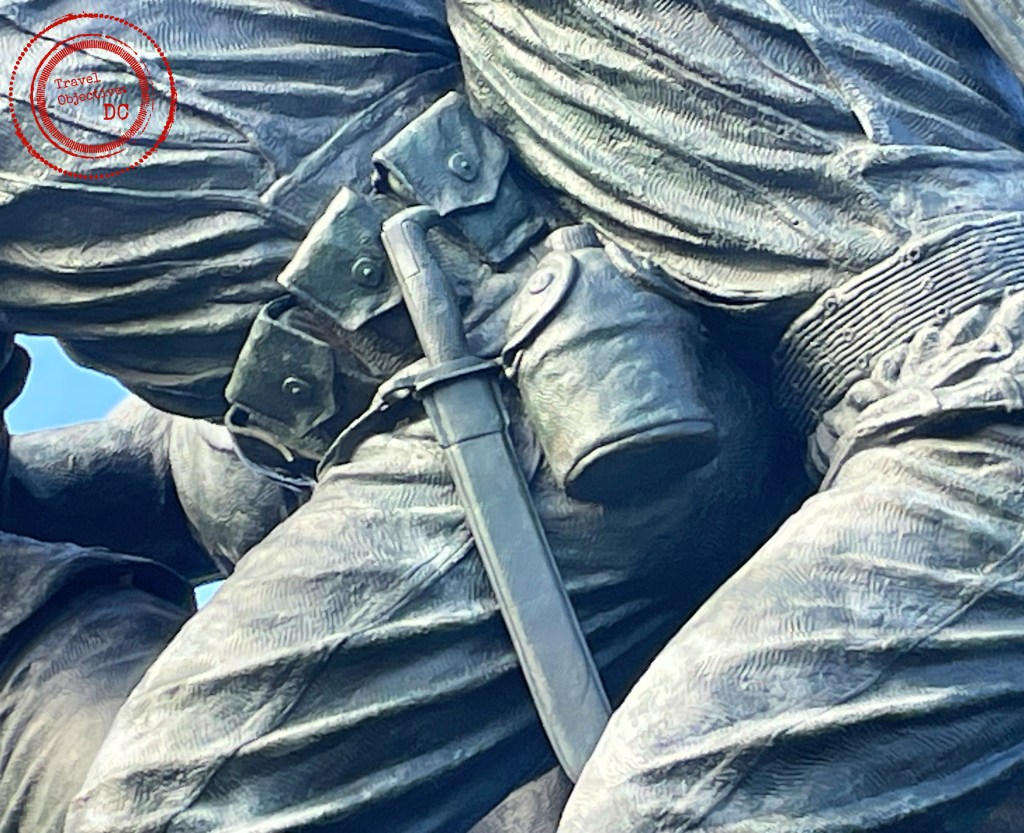 Note the sculptor Felix de Weldon’s precise detail on the Marines’ uniforms and equipment. Given the large size of the statues, the canteen would hold eight gallons of water.