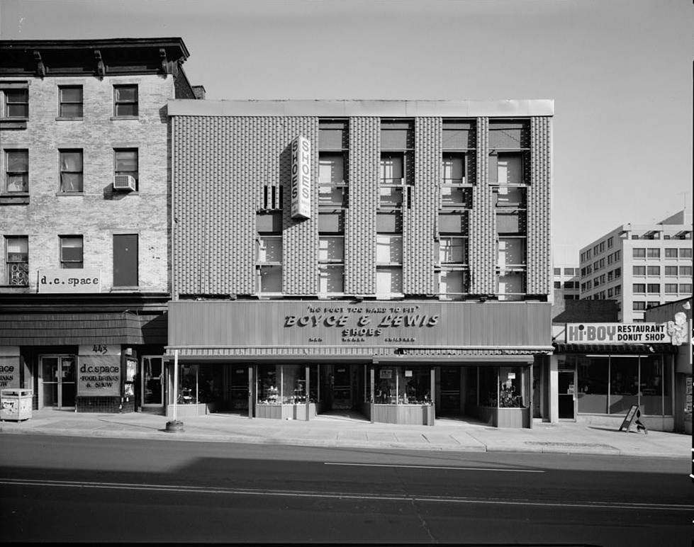 Photograph of Boyce and Lewis Shoe Store at 437 7th Street. The facade hides the original brick exterior and several windows on the 2nd and 3rd floors.